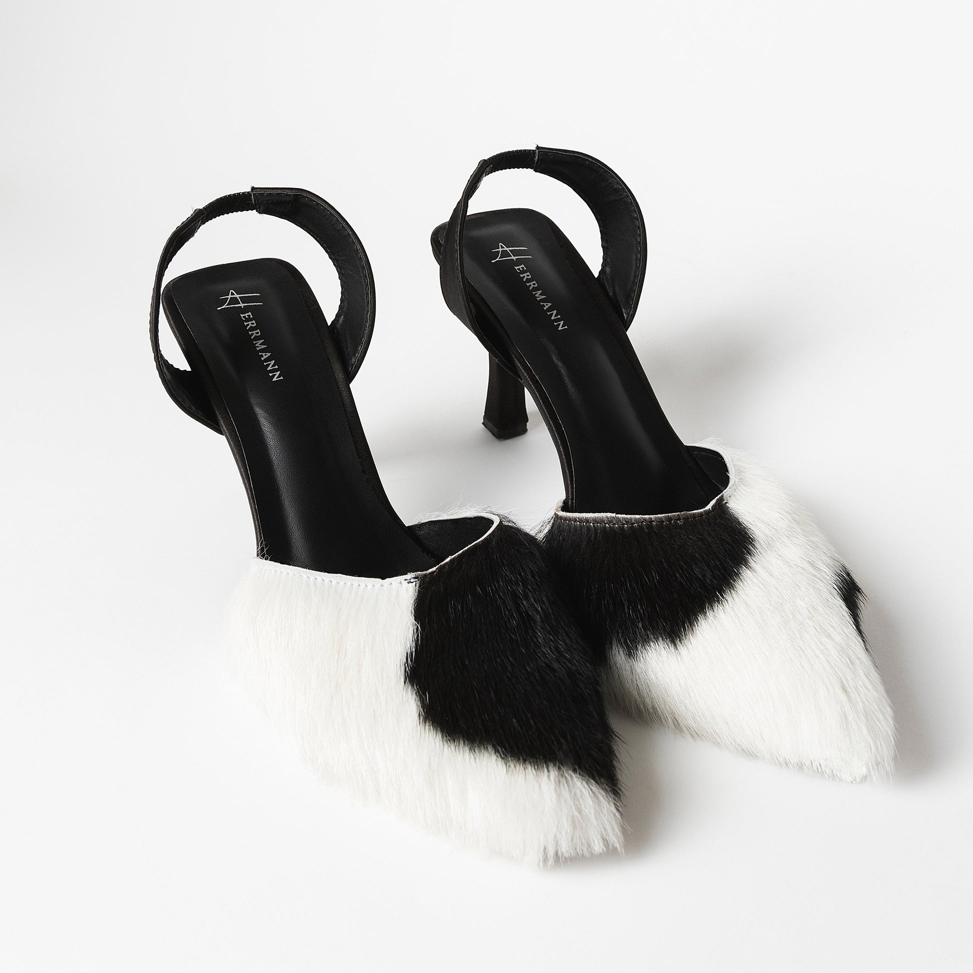 El empeine está elaborado en pelo de vaca genuina, cuidadosamente seleccionado para conservar su textura natural y su contraste orgánico en blanco y negro, haciendo que cada par sea único.