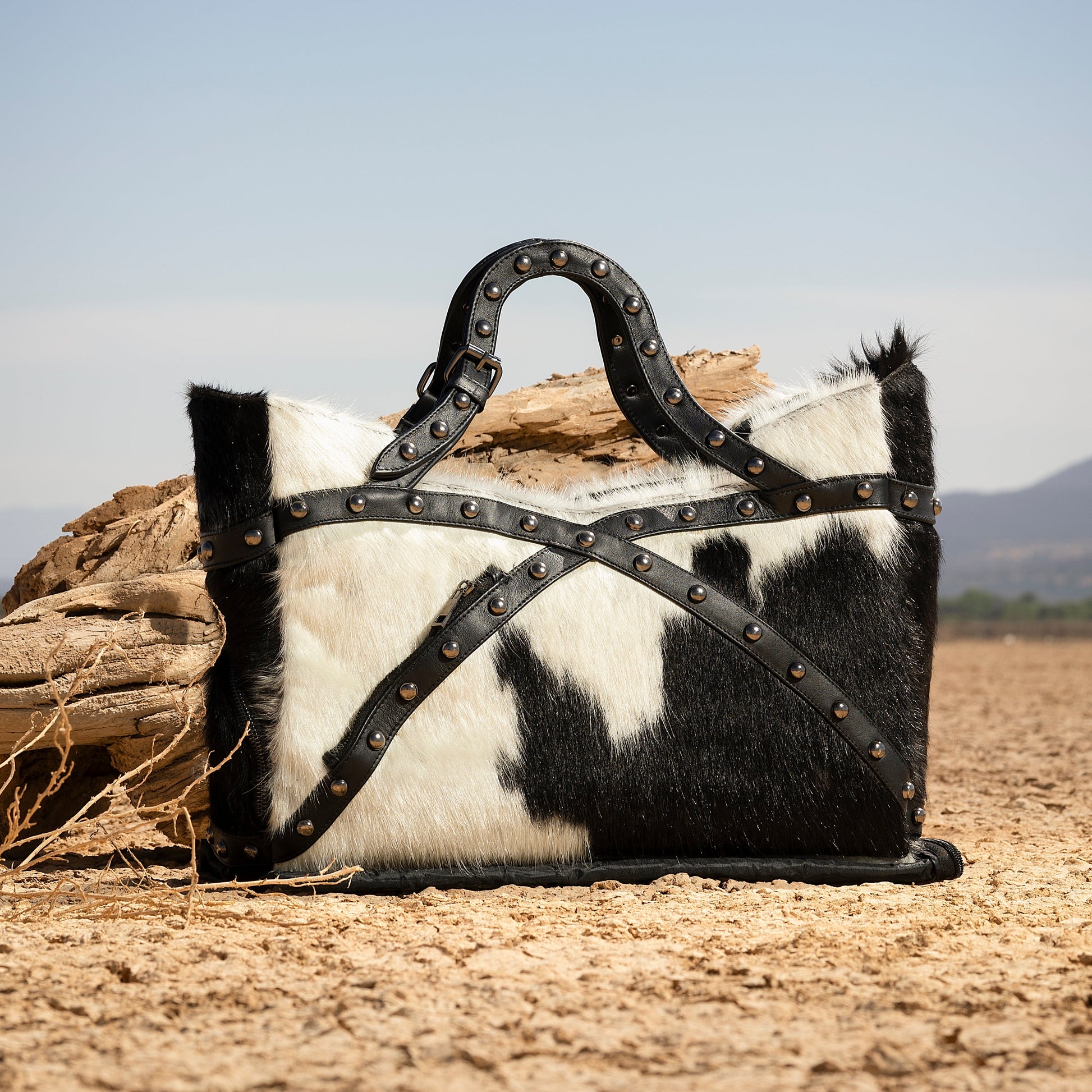 BOLSO DE VIAJE DE PELAJE VACUNO, CON REMACHES NEGRO METALICO.
